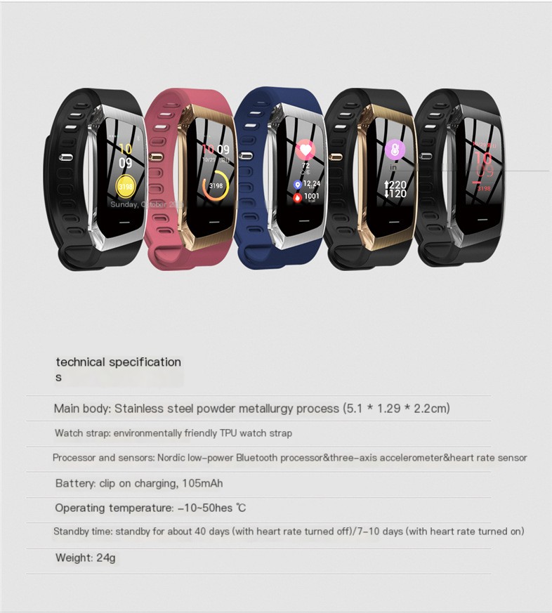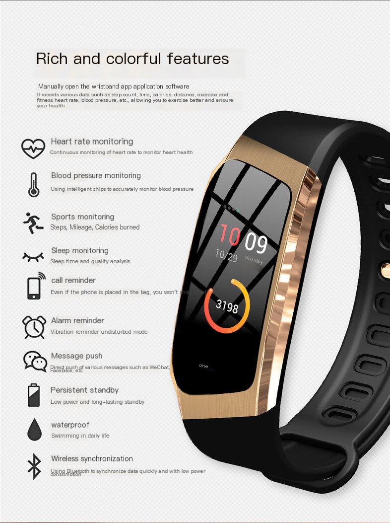 Funções principais: Tempo, contagem de passos, monitor de frequência cardíaca, medição de pressão arterial, calorias, distância, alarme, monitor de sono, lembrete de chamada, lembrete de mensagem, lembrete sedentário, cronômetro, busca por telefone, etc.